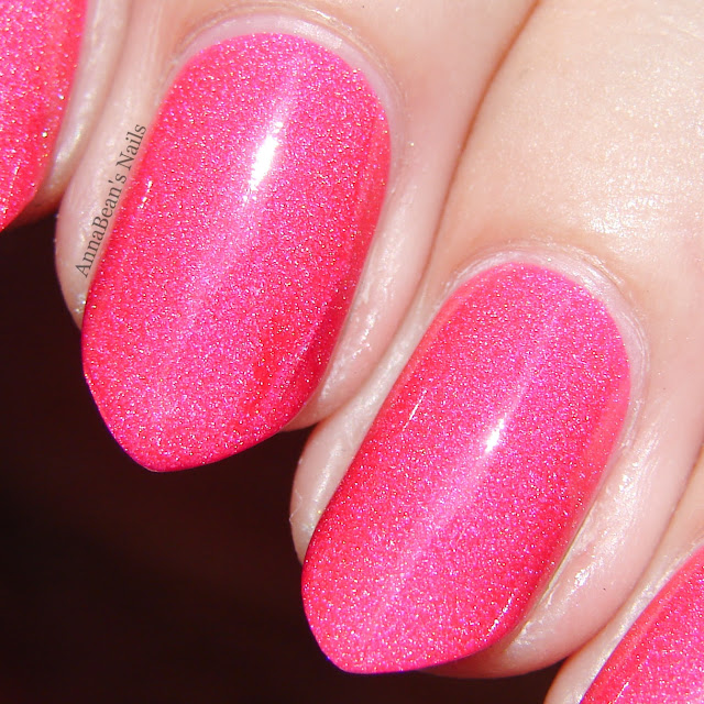 "Stilettos" is a hot pink shade with scattered holographic finish. The holo is slightly less vivid in this than in "Scrunchies", but it is still very evident. Formula again was perfect, so typical of Freckles Polish holographics. Swatches show two coats & top coat.